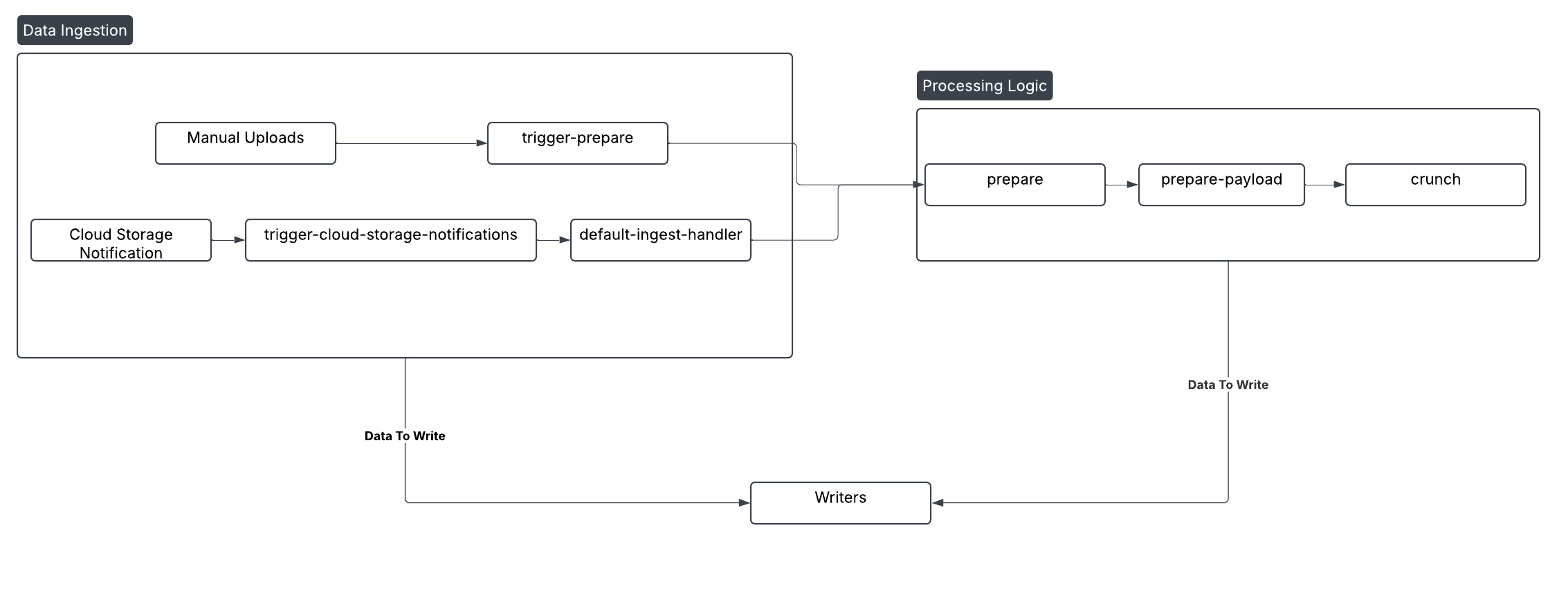 These workloads form the backbone of our data pipeline. They're responsible for bringing your data into the system, preparing it, and applying core business logic. Designed for continuous operation and high throughput, they consume various data streams and messages. Some of the pubsub subscriptions these workloads listen to, are: