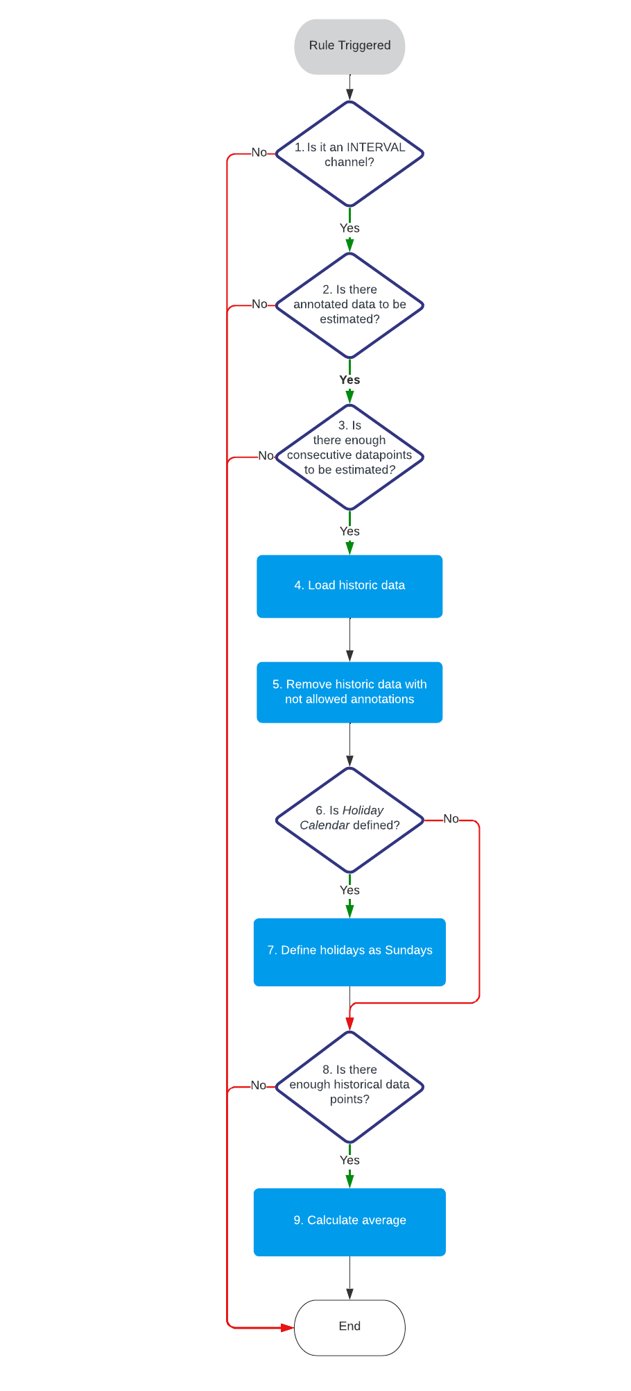 - If there is not enough historical data, then estimation of the datapoint is skipped. The minimum no. of histarical values to be used for averaging is defined in the parameter